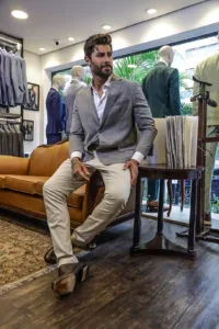 Opte por estilos de ternos mais leves e desestruturados. Blazers sem forro e calças mais soltas proporcionam conforto e permitem maior mobilidade, ideal para cerimônias realizadas em jardins, praias ou vinícolas.